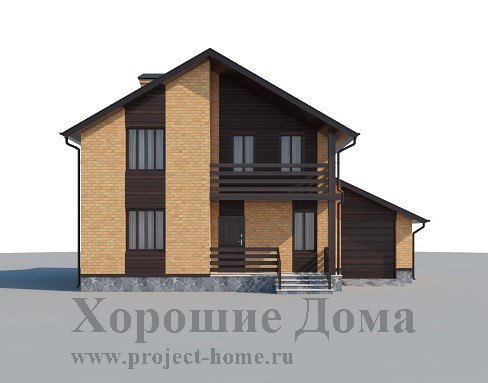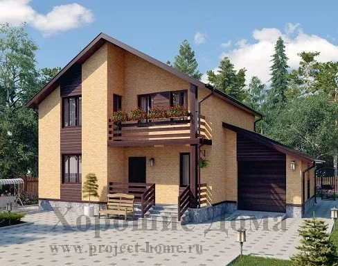 Современный проект двухэтажного коттеджа площадью 147,7 кв. м. подойдет для воплощения даже на небольших участках. Этот особняк станет комфортным постоянным жилищем или же временным пристанищем на время загородного отдыха. Внешне привлекательный коттедж с простым дизайном и двускатной крышей не имеет цокольного этажа, что обеспечивает значительную экономию при постройке. В планировке запроектирован небольшой гараж-пристройка, рассчитанный на одно авто и размером 18 кв. м.