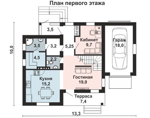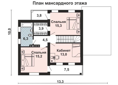 На первом этаже помимо просторной гостиной с выходом на небольшую террасу, а так же кухни и санузла так же находится рабочий кабинет площадью 9,7 кв. м. Лестница на второй этаж запланирована в помещении гостиной. В одной из трех спален второго этажа – хозяйской, размером 15,3 кв. м., имеется собственная гардеробная комната 3,9 кв. м. Вторая по размеру спальня площадью 15,2 кв. м. имеет свой выход на большой балкон второго этажа. Третья спальня имеет площадь 13 кв. м. и отлично подойдет под детскую или, например, мастерскую.