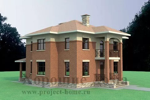 Оригинальный проект двухэтажного коттеджа, имеющий свои особенности при размещении большой семьи, что делает его отличным решением при необходимости разделения быта. Главной изюминкой проекта является наличие двух помещений кухни, обе практически одинаковой площади около 14 кв. м. Это интересное дополнение может стать незаменимым и решающим при выборе подходящего проекта.