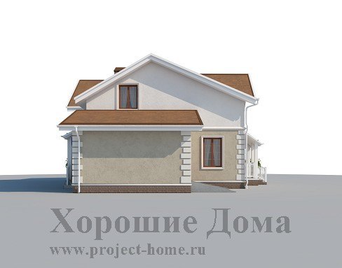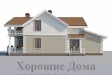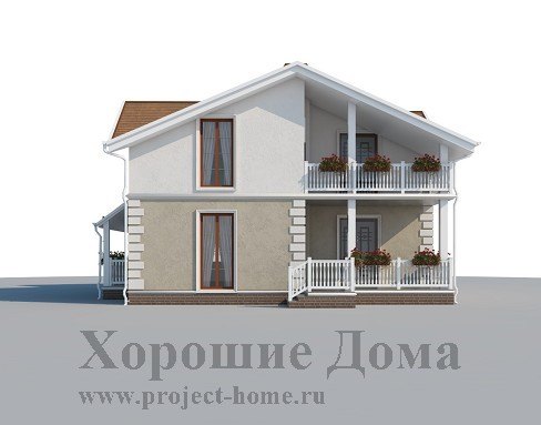 Изящный, лёгкий, светлый, уютный загородный коттедж с оригинальной многосводчатой крышей, покрытой металлчерепицей. Дом двухэтажный с цокольным этажом. Отделка фасада – декоративная штукатурка с элементами декора по углам здания и вокруг оконных проемов. Вход в дом предваряется небольшой террасой с навесом из металлочерепицы.