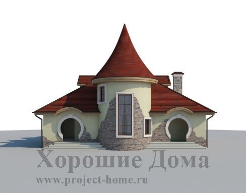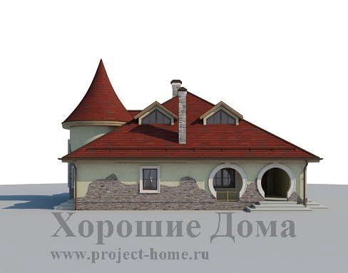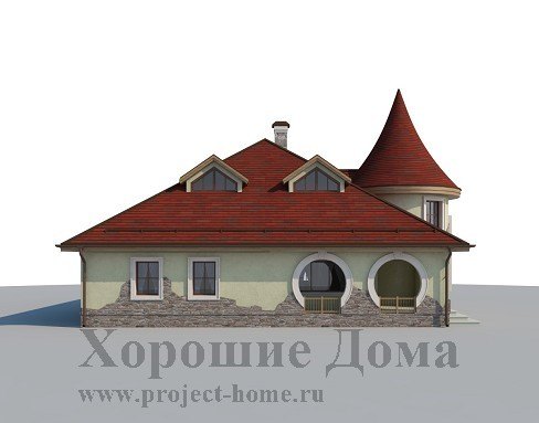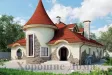 Уникальный по красоте загородный коттедж в стиле модерн восхищает своими оригинальными архитектурными решениями и находками. Очень импозантно смотрится эркер, выполненный в виде круглой башни с витражным окном и крутой винтовой лестницей внутри. Настоящей находкой авторов проекта стали крытые террасы по углам здания, которые имеют не только крышу, но и стены с выразительными круглыми проёмами. Элементы декора, стильная отделка фасада, «слуховые» мансардные окна органично дополняют колоритный образ особняка.