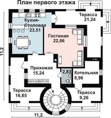 Внутреннее пространство дома очень эргономично. На первом этаже находятся большая прихожая с гардеробом, санузел, просторная гостиная с камином, кухня, совмещённая со столовой и отделённая от неё барной стойкой. Из кухни и прихожей имеются выходы на террасы. Котельная также имеет отдельный вход со стороны террасы.