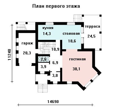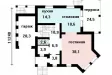 Внутренняя планировка первого этажа решена в виде плавно перетекающих друг в друга помещений гостиной и кухни-столовой. Настоящим украшением гостиной является роскошный эркер с прекрасным видом в сад. В помещении столовой имеется выход на небольшую крытую террасу, с которой можно спуститься на участок.