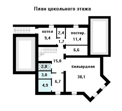 Особняк спроектирован в трехуровневом исполнении, и первым уровнем является цокольный этаж, на котором разместились технические помещения, блок сауны и бильярдный зал. В помещение котельной предусмотрен отдельный вход со стороны участка.