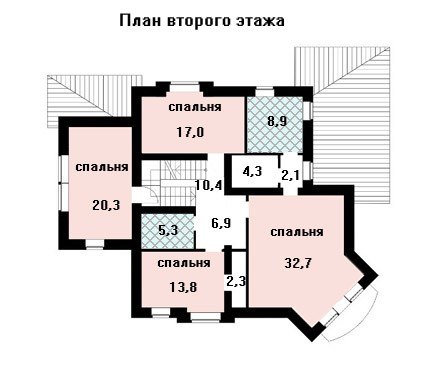 Второй этаж отводится под зону ночного пребывания, который включает в себя три спальни для членов семьи и шикарные апартаменты хозяев дома с ванной комнатой и гардеробом. В светлом эркере апартаментов можно обустроить будуар или, наоборот, гостиную зону.