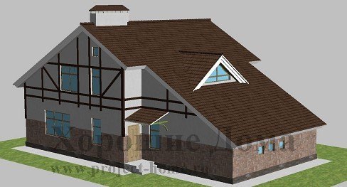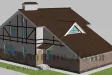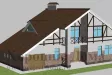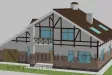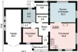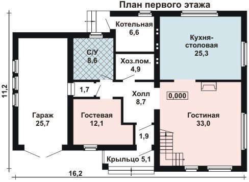 Дом имеет довольно длинный гараж размером 25,7 кв. м., из которого можно попасть в холл особняка. Основной вход в дом предваряет крытое крыльцо площадью 5,7 кв. м. Далее можно попасть в холл, а оттуда в коридор. На первом этаже находится три жилых помещения, это просторная гостиная (33 кв. м.), где так же расположена лестница на второй этаж, помещение кухни-столовой размером 25,3 кв. м. и комната для размещения гостей метражом 12,1 кв. м.