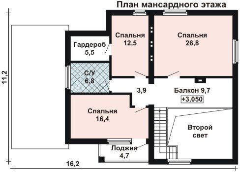 Попадая на второй этаж можно практически сразу выйти на крытый балкон, расположенный прямо надо парадным входом в коттедж. Так же на втором этаже размещены три спальных комнаты, санузел и гардеробная.