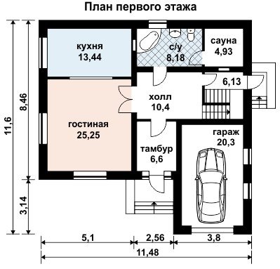 На первом этаже размещена гостиная комната площадью 25,25 кв. м. и примыкающая к ней кухня размером 13,44 кв. м. Тут же предусмотрена небольшая сауна, вход в которую оборудован из помещения ванной комнаты. В холле первого этажа за лестницей проектом предусмотрен дополнительный выход на придомовую территорию.