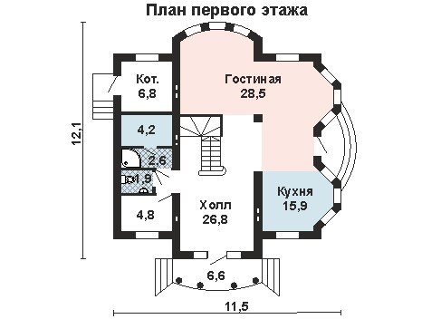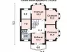 Первый этаж включает в себя кухню, по одной из стен которой находится эркер, а так же просторную гостиную размером 28,5 кв. м., где размещен второй эркер. Помещение котельной расположено в дальней части этажа и имеет отдельный вход с улицы. Из подсобных помещений в доме так же имеется кладовая, размещенная слева от входа.