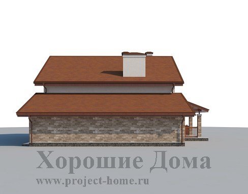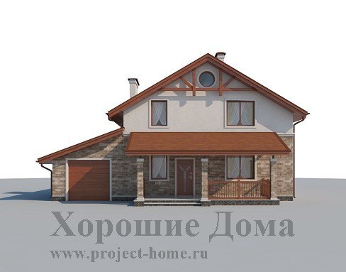 Вход в дом выполнен с крытой террасы с колоннами. Гараж и блок хозяйственных помещений возведены в виде пристройки к основному зданию в одноэтажном исполнении с отдельной крышей.