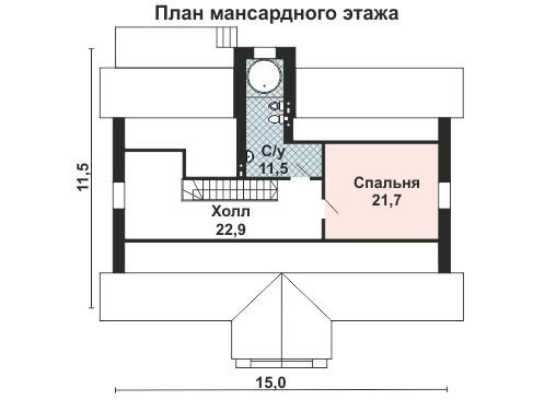 Мансарда не является полноценным этажом и вмещает в себя только одну большую спальную комнату площадью 21,7 кв. м. и отдельный просторный санузел размером 11,5 кв. м.