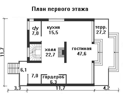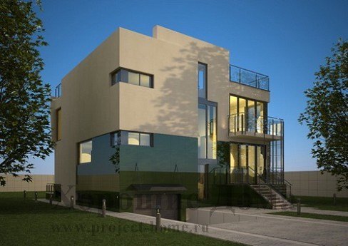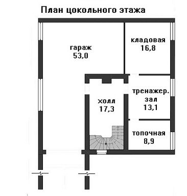 Проект двухэтажного особняка в современном стиле с цокольным этажом и террасой на крыше отлично впишется в урбанистический стиль города. Дом позволяет с уютом разместиться в нем абсолютно всем членам большого семейства. Цокольный этаж включает в себя большой подземный гараж 53 кв. м., выход из которого ведет в просторный холл и далее - в одно из трех помещений: топочную, кладовую или тренажерный зал.