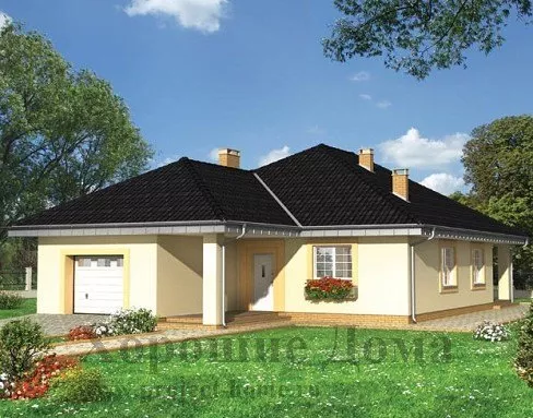 Небольшой по площади, всего 149,1 кв. м., но удивительно гармоничный по внешнему оформлению и планировке загородный коттедж из газобетона станет прекрасным решением для небольших семей. В этом особняке сделан особый акцент на практичность. Одноэтажный дом с пристройкой-гаражом на один автомобиль внутри спроектирован не менее экономично с точки зрения расходования метров.