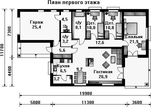 Выход на террасу, расположенную с задней части дома оборудован не только из просторной гостиной, но и из спальной комнаты, занимающей площадь 2,19 кв. м. Помещение кухни довольно небольшое, однако за счет практически полного совмещения с гостиной создается ощущение наличия гораздо большего пространства.