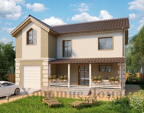 Двухэтажный дом: проект с гаражом и верандой, 11x12