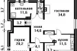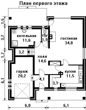 Площадь первого этажа делится на жилую часть и пристройку-гараж размером 20,2 кв. м. Изначально по проекту на первом этаже дома предусмотрена просторная гостиная с домашним камином, площадь ее составляет 34,8 кв. м. Справа от гостиной расположено помещение кухни 11,5 кв. м., имеющей собственное небольшое помещение кладовой.