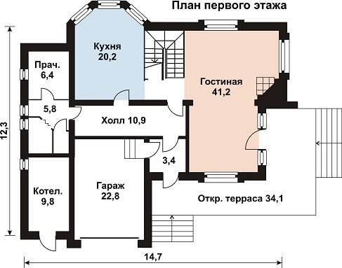 На первом этаже предусмотрен большой встроенный гараж, прачечная, кухня и внушительных размеров гостиная. Кухня совмещена со столовой и занимает помещение с трёхгранным эркером. Гостиная оборудована угловым камином и имеет выход на просторную террасу. Между кухней и гостиной разместилась лестница, ведущая на мансардный этаж. Котельная, расположенная с левой стороны от входа в дом, оборудована отдельным входом со стороны участка.