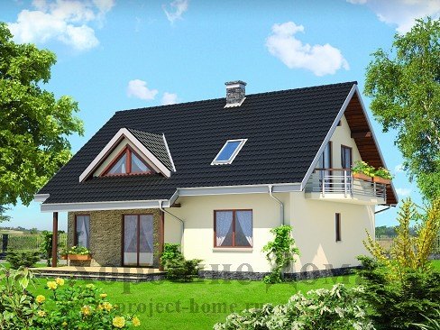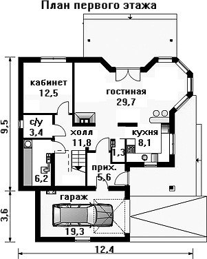 Общая площадь коттеджа по проекту составляет 203,7 кв. м. и распределена между полноценным первым этажом и вторым – мансардным. Особую пикантность дому придает наличие эркера на первом этаже, который служит балконом для второго этажа. Гараж размером 19,3 кв. м. пристроен к дому с левой стороны и имеет собственный внутренний выход в прихожую дома. Гостиная комната, расположенная на первом этаже, имеет причудливую форму, во многом благодаря эркеру, ее площадь составляет 29,7 кв. м. Почти не отделена от гостиной кухня, ее зона лишь слегка обозначена короткой стенкой, служащей в основном для дополнительного дизайна помещения. Так же на первом этаже расположен рабочий кабинет и хозпомещения.