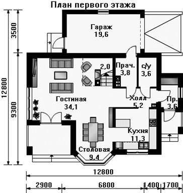 Первый этаж представляет единое пространство с зонированием площади под кухню, столовую и гостиную с камином. Кухня отделена от общего пространства небольшими перегородками, столовая разместилась в уютном эркере. Кроме того на первом этаже имеется санузел и помещения для прачечной.
