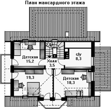 Всю площадь мансардного этажа занимают три спальни и просторная ванная комната. Все спальни имеют выходы на балконы.