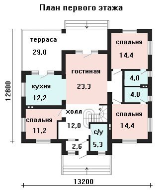 Все остальные помещения для комфортного и удобного проживания расположены на первом этаже. Это просторная гостиная размером 23,3 кв. м. с выходом на большую террасу площадью 29 кв. м., обращённую в сад, кухня и три спальни, две из которых оборудованы персональными гардеробными комнатами по 4 кв. м. Справа от входа находится небольшой санузел с территорией 5,3 кв. м.
