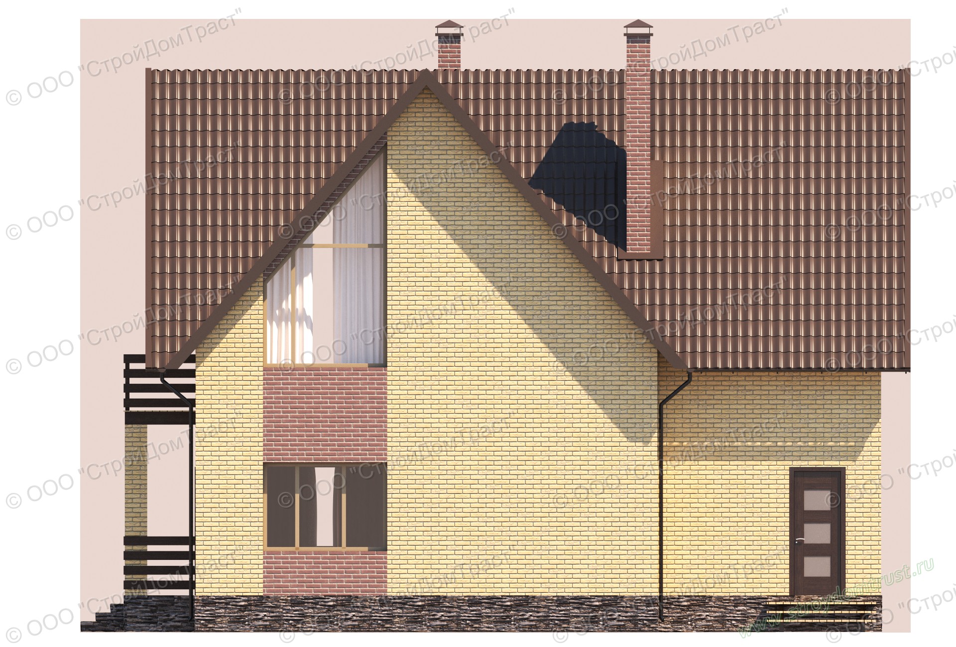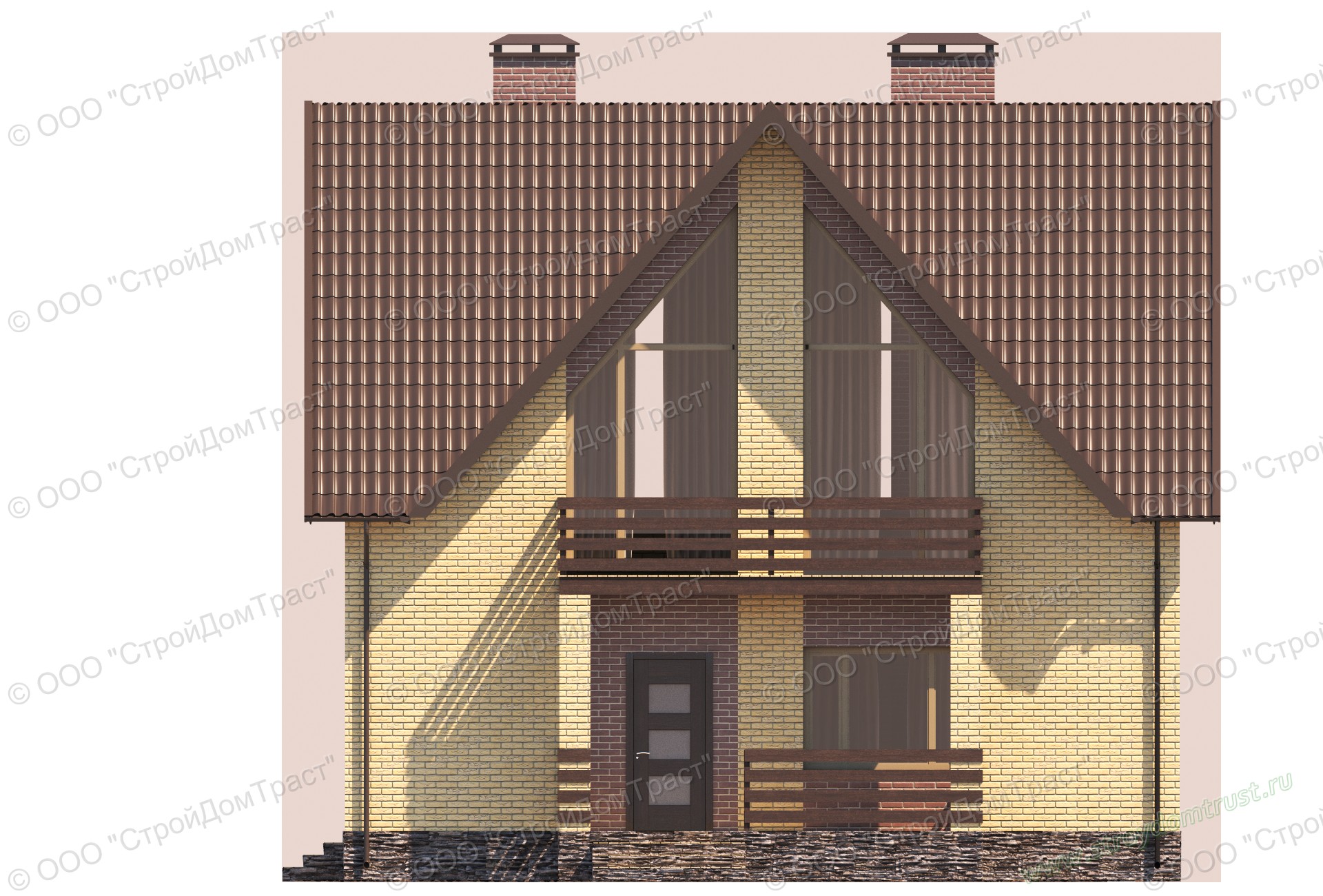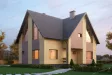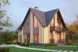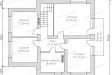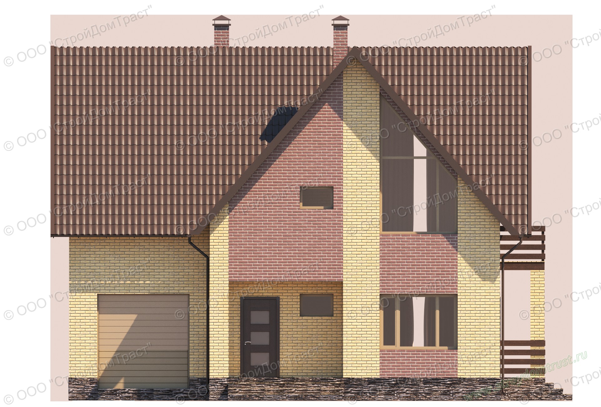 В доме запланирован гараж и терраса. На нижнем этаже кроме прихожей и котельной расположена кухня и гостиная.