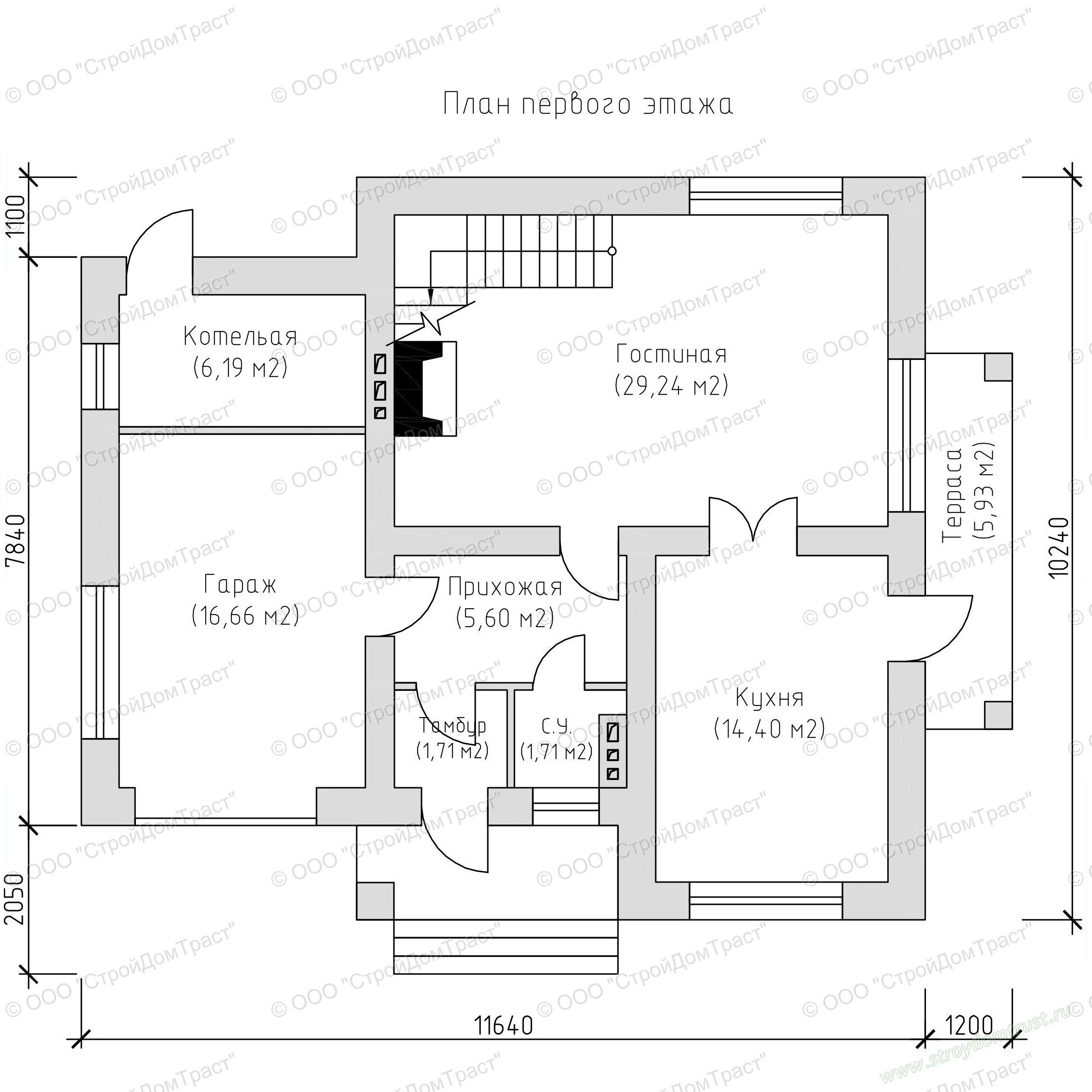 Особняк в два этажа с гаражом, размеры 12,84 х 10,24
