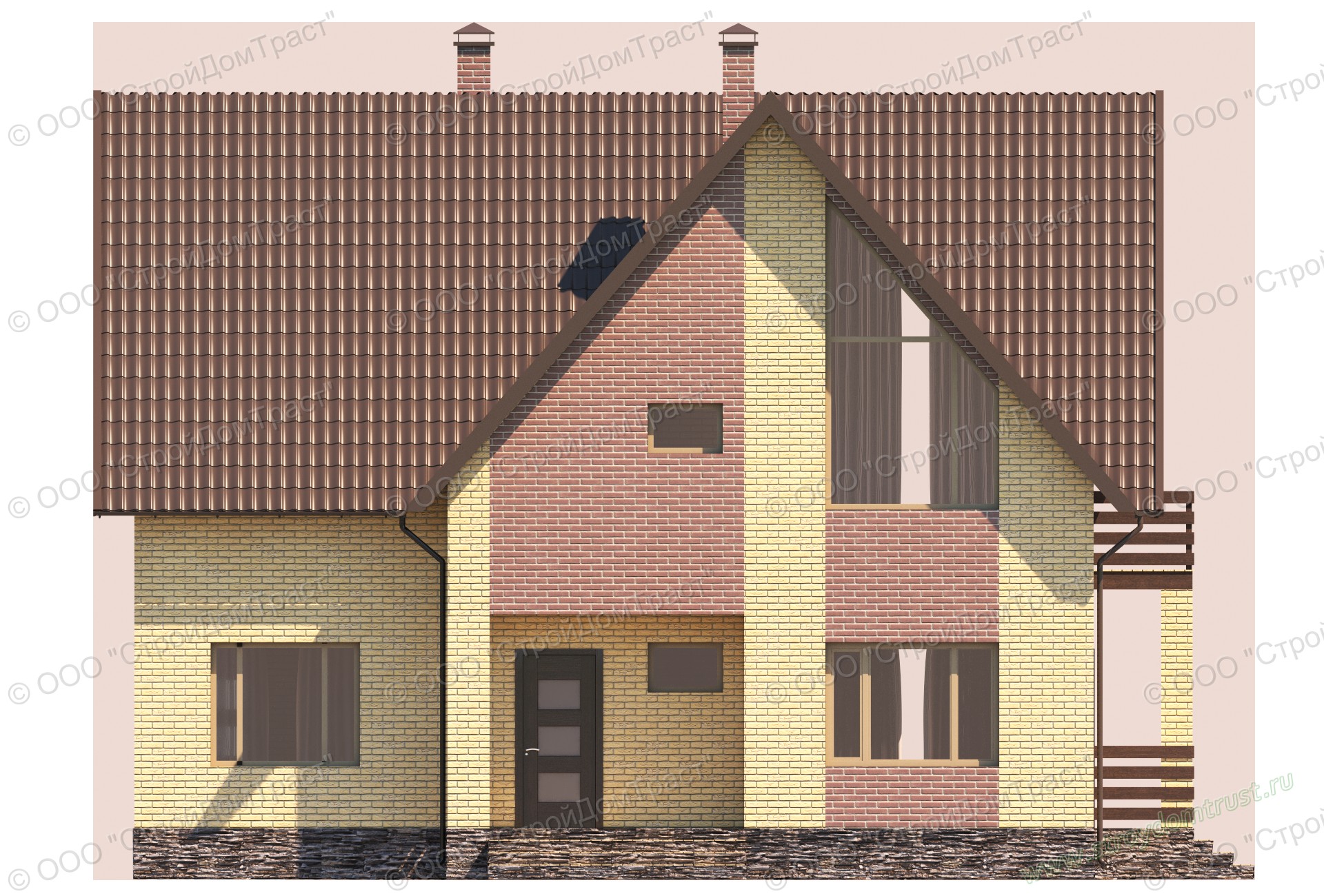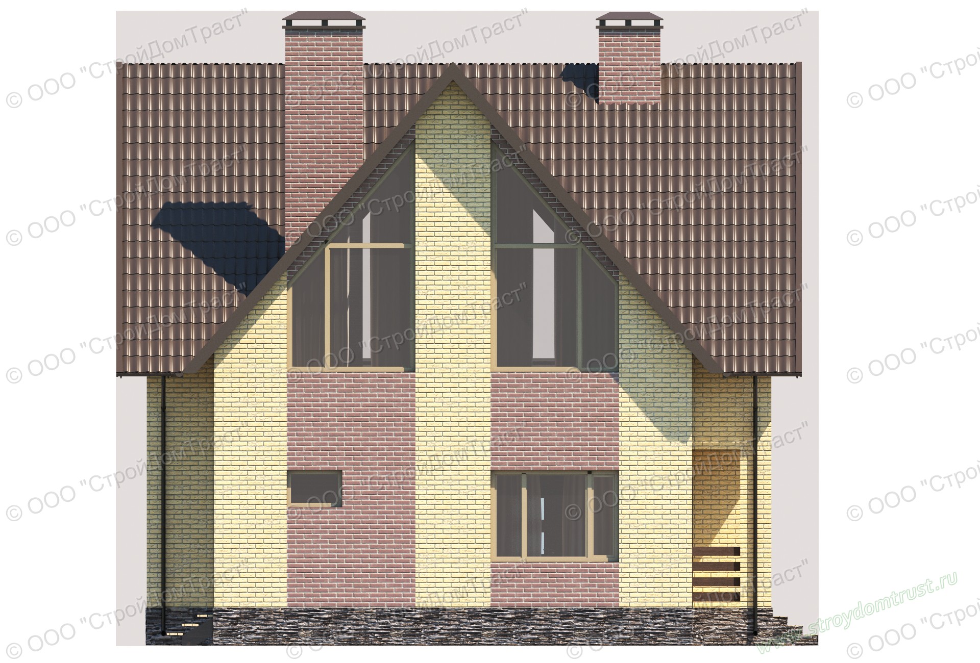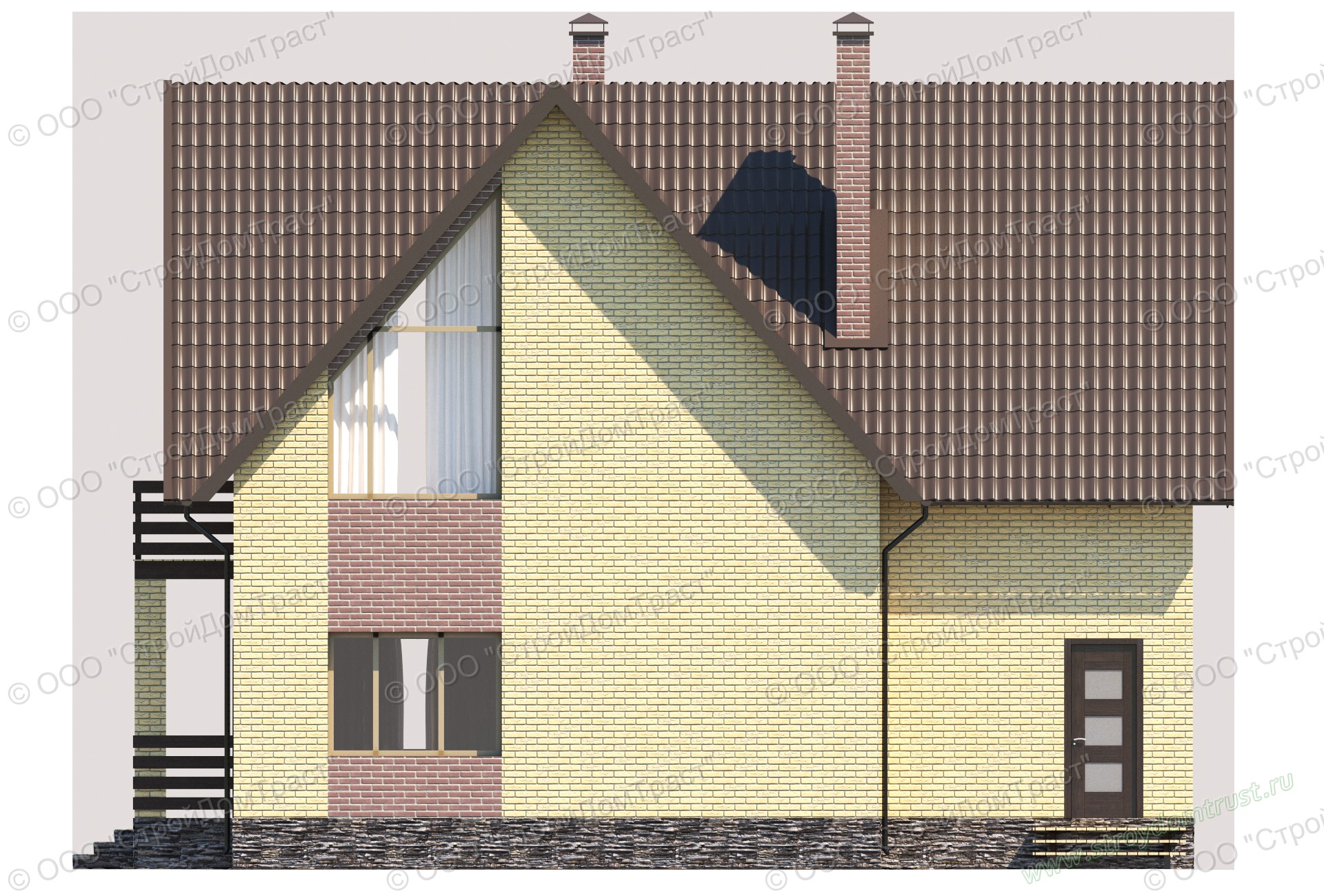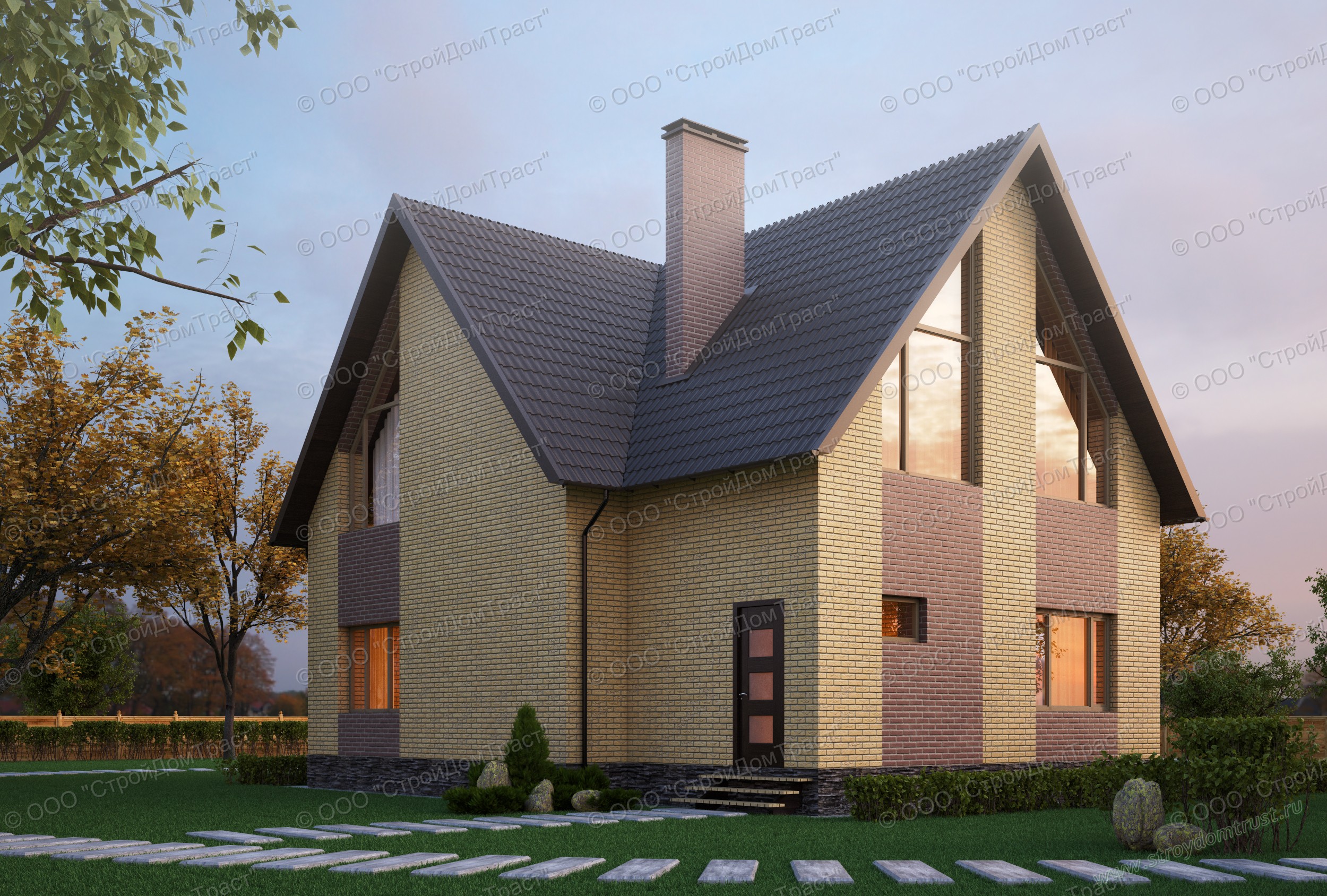 Облицовка сооружения комбинированная. Здесь используется кирпич двух цветов: ярко-жёлтого и цвета какао с молоком. Такого же оттенка и крыша дома, сделанная из металлочерепицы.