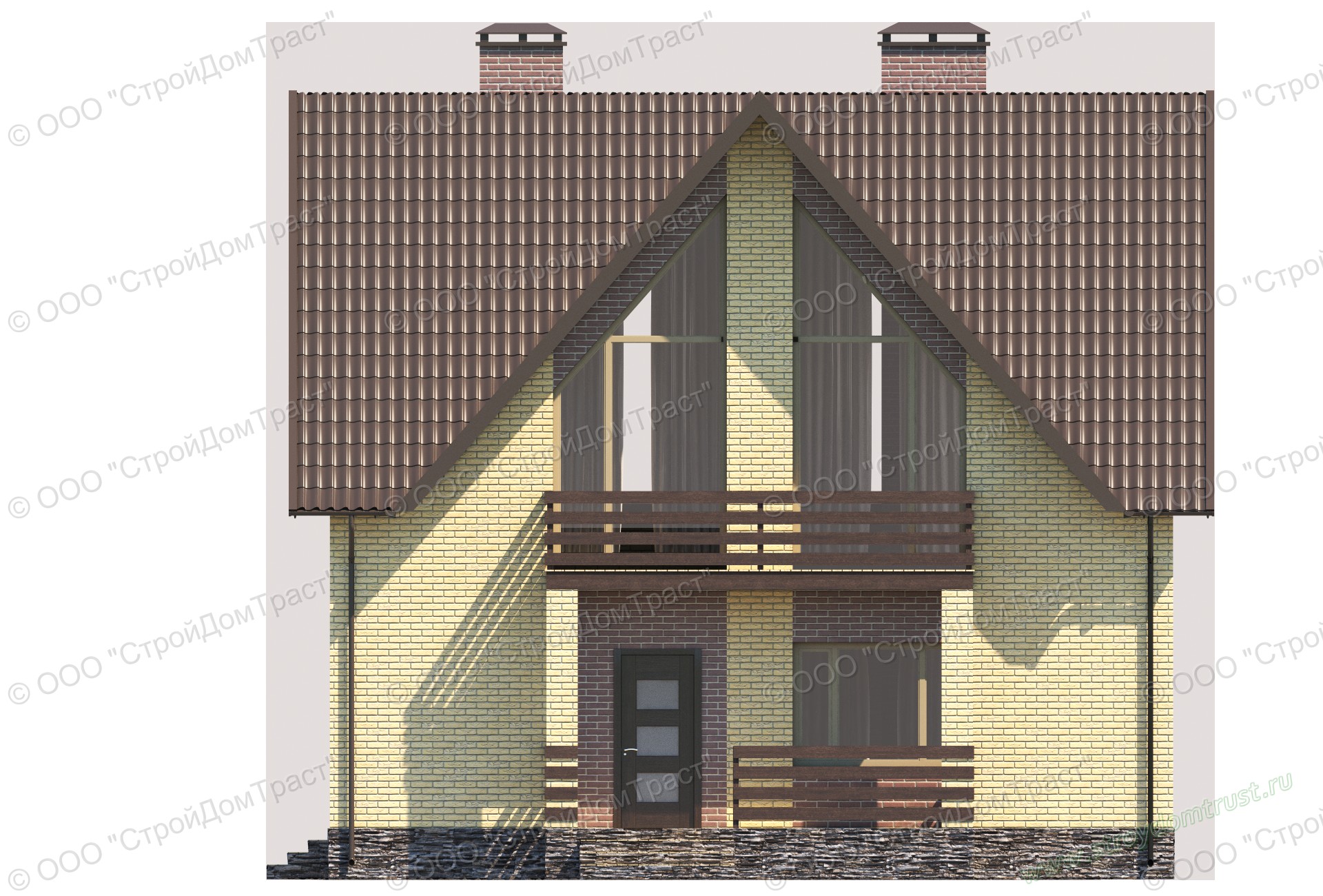 Привлекают внимание большие окна трапециевидной формы со скосами сверху. Окна второго этажа являются панорамными, так как по высоте практически совпадают с высотой комнат.
