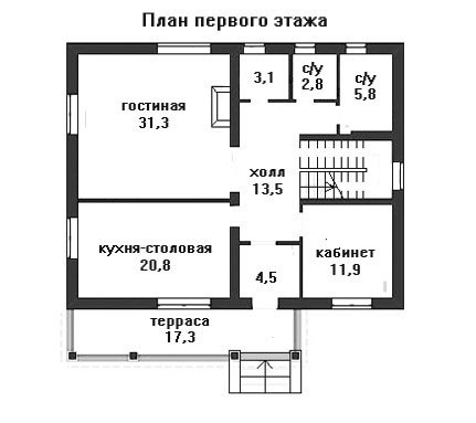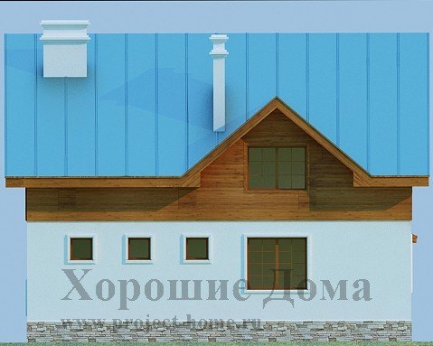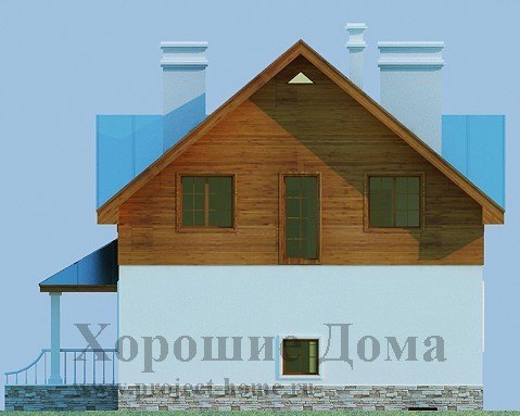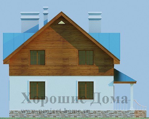 Отличный проект для постройки загородного коттеджа, исполненный в деревенском стиле. Приятное глазу оформление экстерьера дома оставляет впечатление надежности и уюта. Крытое крыльцо с маленькой террасой ведет к главному входу, откуда мы попадаем сначала в небольшой тамбур и далее в просторный холл, где расположена удобная достаточно широкая лестница на второй мансардный этаж.