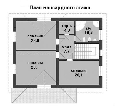 Второй этаж по плану предлагает три довольно больших спальных комнаты размером 20,1 кв. м., 23,9 кв. м. и 28,1 кв. м. Так же на втором этаже проектом запланирована общая гардеробная площадью 4,3 кв. м. и дополнительный большой санузел - 10,4 кв. м.
