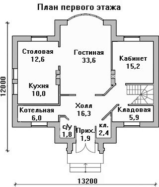 Гостеприимный вход в дом украшен небольшими пилонами, далее через прихожую и просторный холл попадаем в уютную гостиную, рабочий кабинет и на лестницу. Гостиная комната украшена красивым эркером и оконным витражом на всю высоту помещения. Гостиная образует единое пространство с находящейся по соседству кухней-столовой. Помещение кабинета может быть также использовано и в качестве гостевой спальни, это уже зависит от желания хозяев особняка. Также на первом этаже нашлось место для котельной, санузла и двух небольших кладовых комнат.