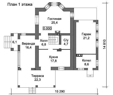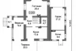 На первом этаже дома спланирована зона дневного пребывания членов семьи, а также гараж для одной автомашины и котельная. Большая кухня, совмещённая со столовой и имеющая выход на террасу, находится по одну сторону от небольшого холла, по другую его сторону расположилась просторная светлая гостиная, пространство которой увеличено за счёт трёхгранного эркера. Украшением гостиной является большой камин.