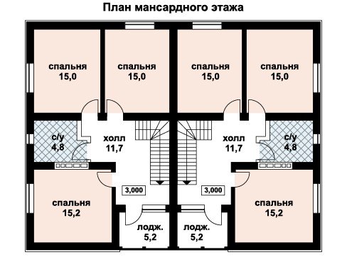 На мансардном этаже имеются три одинаковые по площади спальни и санузел.