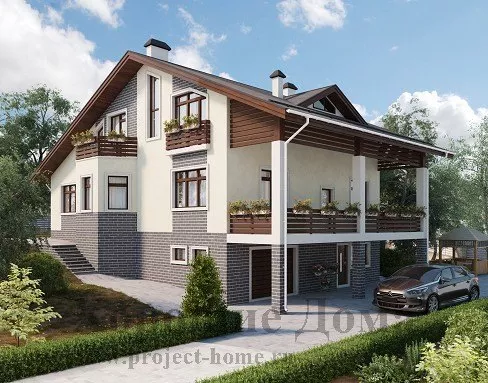 Современный, практичный, стильный загородный дом одинаково подходит, как для круглогодичного проживания семьи из 3-5 человек, так и для летнего отдыха в качестве шикарной дачи. Проект особняка предусматривает его возведение на участках с неровным холмистым рельефом или на берегу водоёма.
