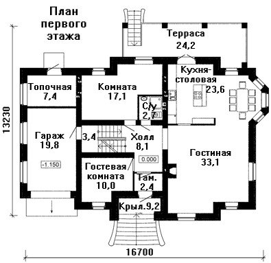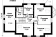 Парадный вход в коттедж предваряет небольшое крытое крыльцо, откуда можно попасть в маленький тамбур и далее в довольно просторный холл, где находится лестница на мансардный этаж. В правой части первого этажа предусмотрена просторная гостиная, которая совмещена с кухней-столовой, где по одной стене размещен оригинальный эркер. Тут же на этаже запланированы две гостевые комнаты – 10 кв. м. и 17,1 кв. м.