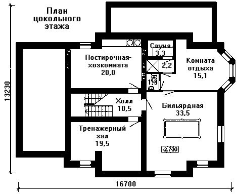 Цокольный этаж представляет собой совокупность полезных как хозяйственных, так и жилых помещений. Среди них - бильярдный зал размером 33,5 кв. м., комната отдыха с сауной и санузлом, а также тренажерный зал и постирочная.