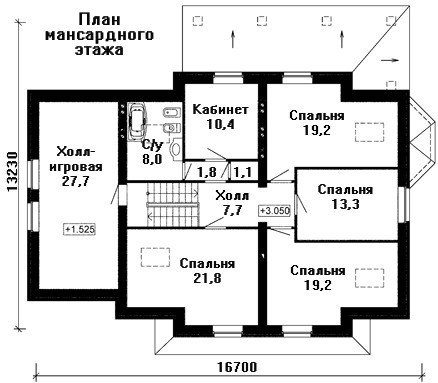 Мансардный этаж почти полностью представляет собой спальную зону из четырех спален, кабинета и игровой комнаты.