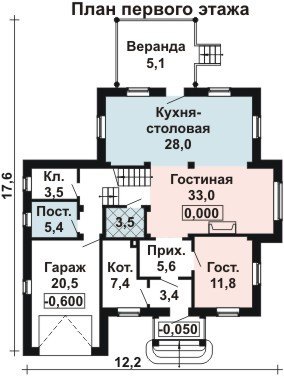 Коттедж имеет гараж-пристройку, рассчитанную на довольно крупное семейное авто, а так же веранду позади дома, площадью 5,1 кв. м., ведущую на остальную придомовую территорию. На веранду можно попасть из просторной кухни-столовой площадью 28 кв. м., практически совмещенной с гостиной комнатой размером 33 кв. м. Помимо этого первый этаж включает в себя такие необходимые помещения, как котельная, кладовая и постирочная, а так же дополнительная гостевая комната справа от парадного входа.