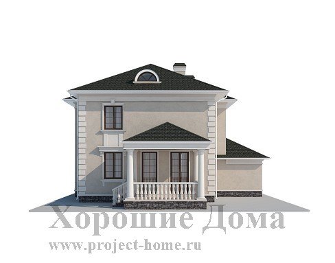 Благородный внешний вид этому особняку придают оригинальные элементы внешнего декора такие, как колонны, встречающие посетителей на крыльце, а так же на крытом балконе, особые черты сводов крыши и смелые дизайнерские элементы на фасаде здания. Общий стиль коттеджа указывает на тонкий вкус его хозяев и изысканность их предпочтений.