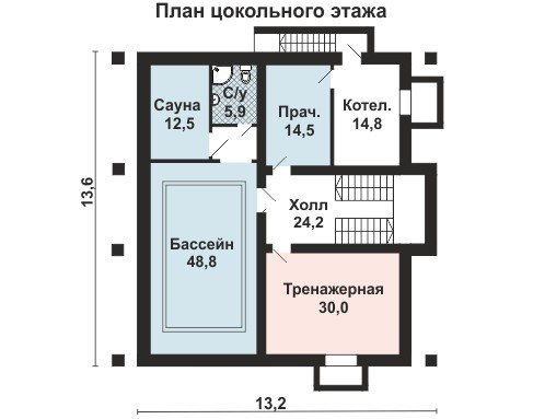 Внутреннее наполнение дома также не оставит равнодушным. Цокольный этаж полностью отведён под зону для активного отдыха и хозяйственный блок. На нем разместились бассейн, тренажерный зал, сауна, котельная, прачечная и санузел.