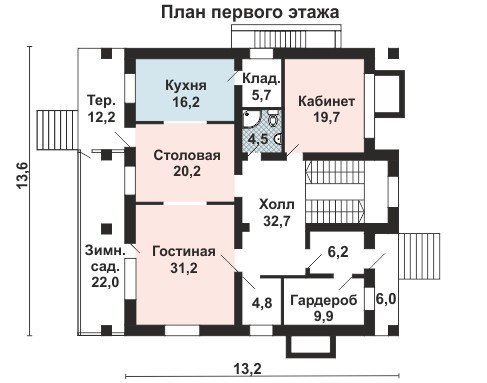 Пространство первого этажа - это зона дневного пребывания. Там расположены тамбур, просторный холл, гостиная с выходом в зимний сад, который находится на застеклённой террасе, а также кабинет, гардеробная комната, два подсобных помещений, которые можно оборудовать под кладовые комнаты разного назначения, кухня и столовая. Кухня от столовой, как и столовая от гостиной, отделена только арочными проёмами. Из кухни имеется выход на застеклённую террасу.