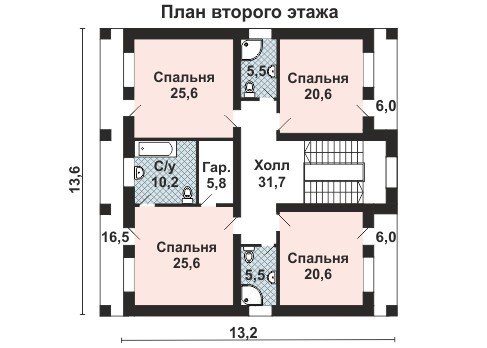 На втором этаже симметрично по отношению к центральной оси дома расположены 4 просторные спальни и 2 санузла. На оси симметрии находится ванная комната с джакузи. Все спальни имеют выходы на уютные крытые террасы.