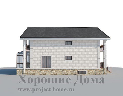 Отделка дома - облицовочный кирпич, цоколь и эркер отделаны природным камнем, углы эркера украшены архитектурным декором в виде рустов.