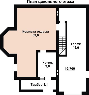 Перепад между высоким и нижним уровнями рельефа очень большой, со стороны нижнего уровня цокольный этаж полностью находится на поверхности земли, с этой стороны устроены вход на цокольный этаж и въезд в гараж, рассчитанный на две автомашины. На цокольном этаже кроме гаража размещены котельная и обширная зона отдыха, которая может быть распланирована по желанию заказчика.