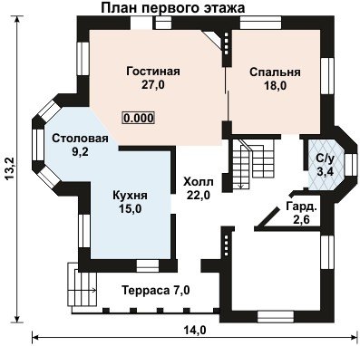 Планировка особняка очень логичная и рациональная, и обеспечивает высокий уровень комфорта. Первый этаж предназначен для зоны дневного пребывания, это помещения кухни, столовой и гостиной, образующие единое пространство. Столовую украшает трехгранный эркер, а гостиную комнату - большой камин в углу помещения. Соседствует с гостиной гостевая спальня.