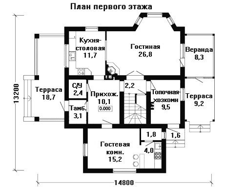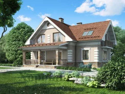 Вход в дом выполнен в виде крытой террасы с колоннами. Через небольшой тамбур попадем в просторную прихожую, из неё на лестницу, кухню и гостиную. Помещения кухни и гостиной разделяются арочным проёмом. Украшением гостиной являются светлый эркер и камин. Из гостиной можно попасть на веранду, логическим продолжением которой является крытая терраса.
