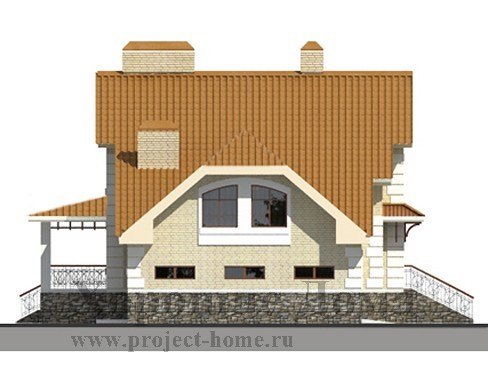 Снаружи, помимо приятной глазу отделки фасада, оригинальный вид дому придаёт широкая лестница, ведущая к центральному входу, расположенному под длинным навесом, оберегающим посетителей от непогоды.