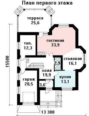 В доме предусмотрен гараж площадью 20,5 кв. м., рассчитанный на одну семейную машину. Благодаря округлым линиям гостиная, плавно перетекающая в столовую с широким проходом в помещение кухни, имеет собственный оригинальный дизайн, который позволит украсить ее в неповторимом стиле, исходя из предпочтений обладателей этого прекрасного дома.