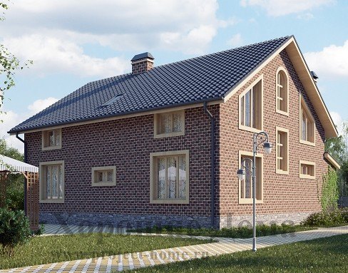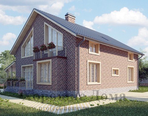Фасад дома отделан облицовочным кирпичом, двухскатная крыша покрыта металлочерепицей. Цоколь декорирован натуральным камнем.